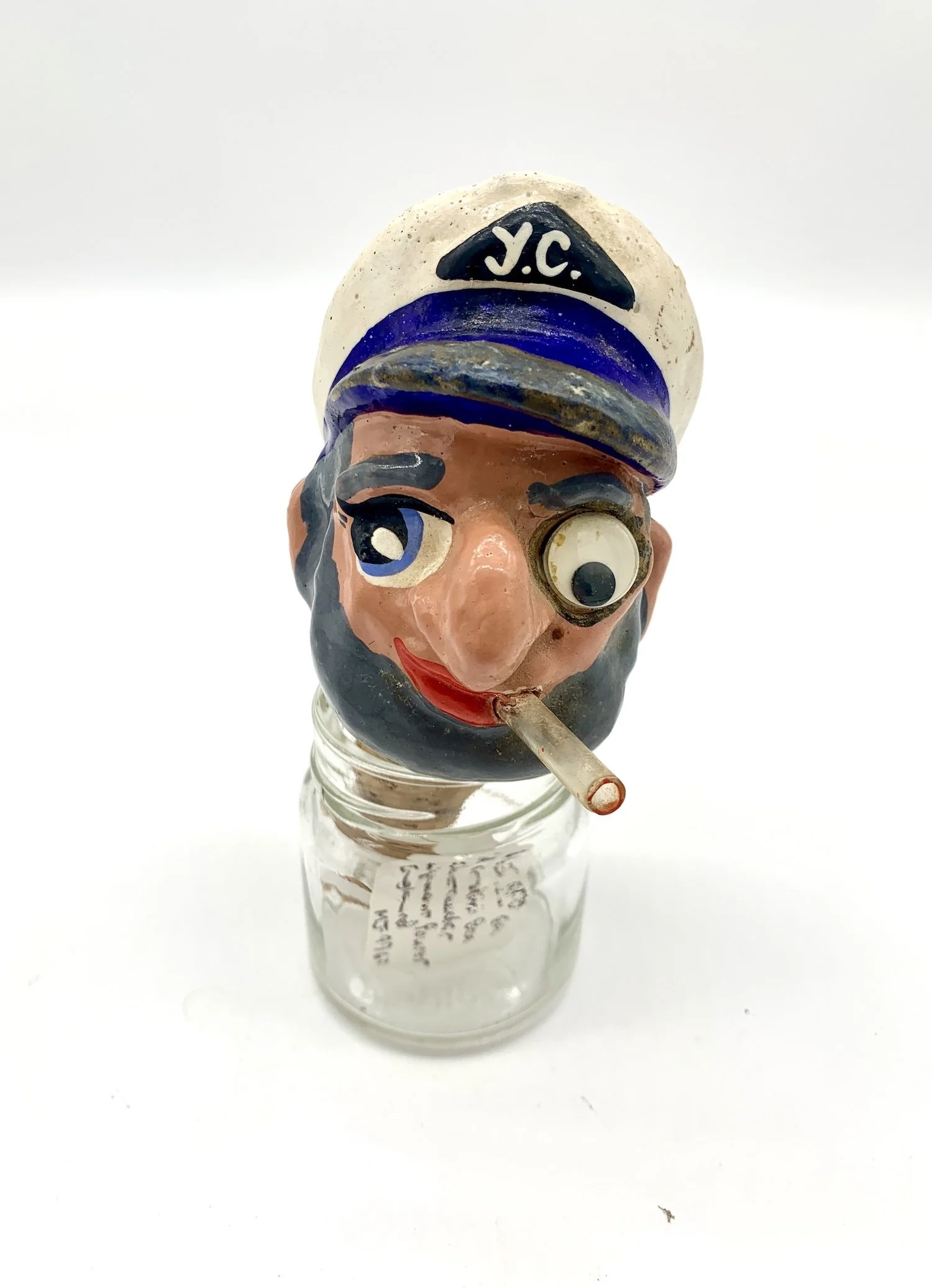 Collectible “A Kinki Bee Character” hand-painted papier-mâché pour spout of a captain with a googly eye smoking a cigarette. Great condition with only minor paint chips as shown. Roughly five inches tall.
